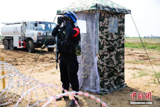 8月15日至18日,公安部常备维和警队将战斗分队全员全装机动至陌生复杂地域,就兵力投送、装备应用、执勤巡逻、应急处突、综合保障等多个要素展开维和实兵实装综合演练。图为队员在模拟营地进行固定哨位值守。