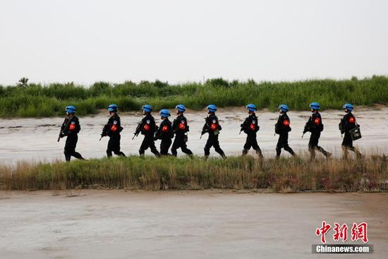 8月15日至18日,公安部常备维和警队将战斗分队全员全装机动至陌生复杂地域,就兵力投送、装备应用、执勤巡逻、应急处突、综合保障等多个要素展开维和实兵实装综合演练。图为巡逻小队在滩涂上开展武装巡逻。